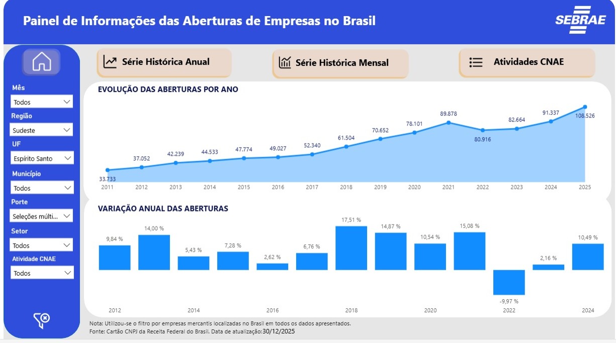 O ano de 2025 foi o ano dos pequenos negócios. De janeiro a dezembro, mais de 5 milhões de microempreendedores individuais (MEI), microempresas (ME) e empresas de pequeno porte (EPP) foram registrados em todo o país. E esse número deve continuar crescendo em 2026. De acordo com a mais recente edição do Monitor Global de Empreendedorismo (Global Entrepreneurship Monitor – GEM 2024), o país tem mais de 47 milhões de potenciais empreendedores que desejam ter um negócio próprio em até três anos. No Espírito Santo, foram abertas 108.526 mil empresas nos portes MEI (microempreendedor individual), ME (microempresa) e EPP (empresa de pequeno porte) em 2025. O número de abertura de empresas vem numa crescente desde 2022, quando foram contabilizados 80.916 mil novos empreendimentos, demonstrando um crescimento de 34%.